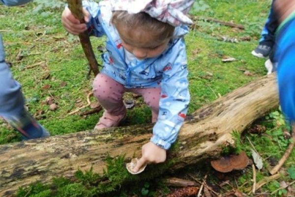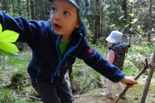 Wir haben die Materialien des Waldes (Moos, Stöcke, Tannenzapfen …) mit all unseren Sinnen wahrgenommen.