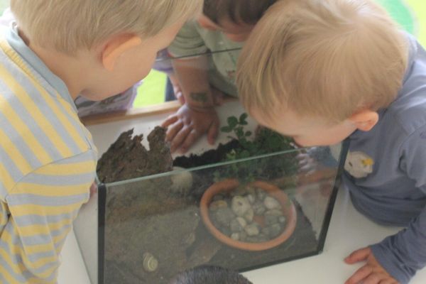 Gemeinsam beobachten wir unsere 5 kleinen Raupen, die in einem sicheren Aufzu…